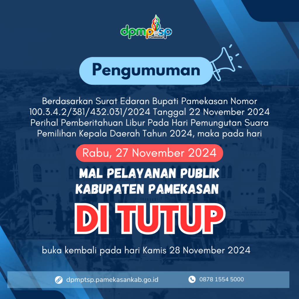 Berdasarkan Surat Edaran Bupati Pamekasan Nomor 100.3.4.2/381/432.031/2024 Tanggal 22 November 2024 Perihal Pemberitahuan Libur Pada Hari Pemungutan Suara Pemilihan Kepala Daerah Tahun 2024, maka Seluruh Layanan Mal Pelayanan Publik Kabupaten Pamekasan DITUTUP pada Hari Rabu, 27 November 2024, buka kembali pada hari Kamis 28 November 2024 Pemilih Berdaulat Negara Kuat