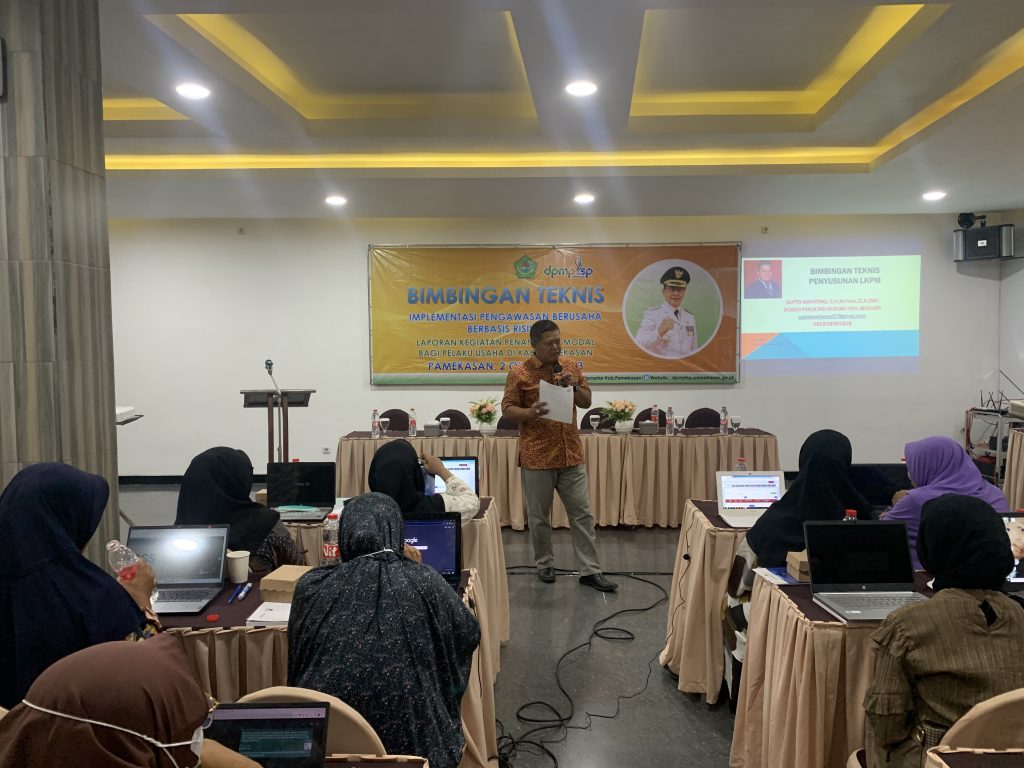 Satuan Tugas Pengawasan dan Pengendalian DPMPTSP Pamekasan melaksanakan Kegiatan Bimbingan Teknis Implementasi Perizinan Berusaha Berbasis Risiko sekaligus Laporan Kegiatan Penanaman Modal Triwulan III Tahun 2023 (Chapter I) pada hari Senin, 02 Oktober 2023 yang bertempat di Mini Ballroom Hotel Cahaya Berlian Pamekasan.