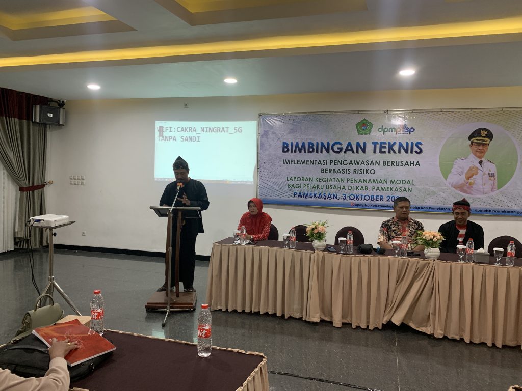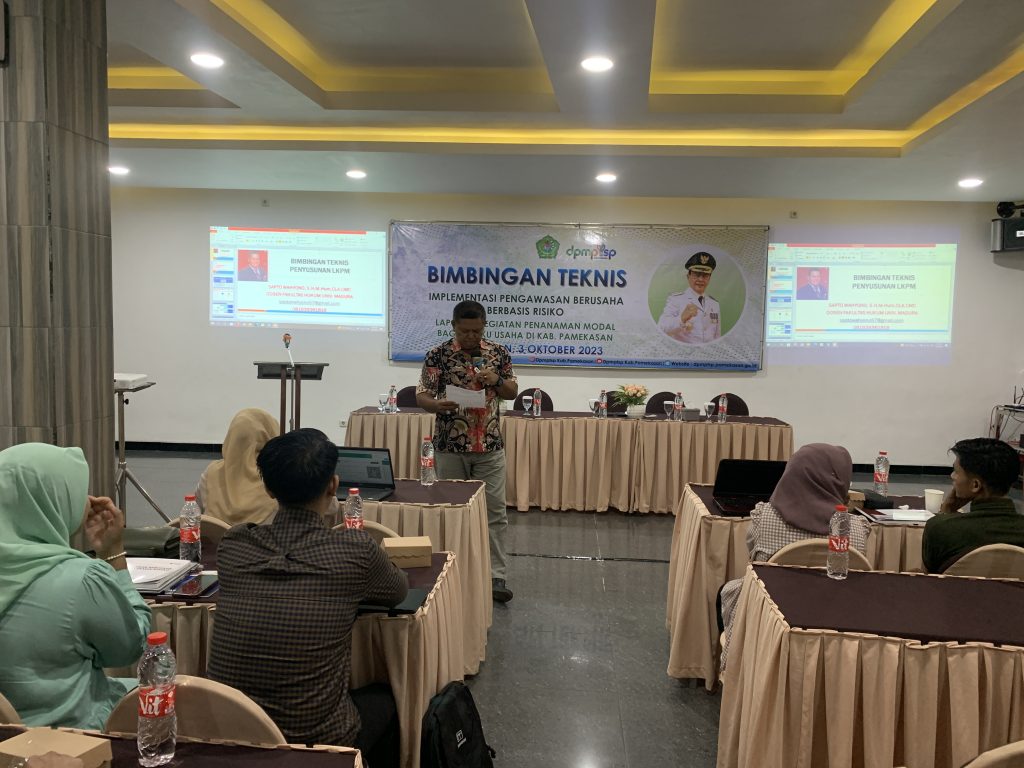 Satuan Tugas Pengawasan dan Pengendalian DPMPTSP Pamekasan melaksanakan Kegiatan Bimbingan Teknis Implementasi Perizinan Berusaha Berbasis Risiko sekaligus Laporan Kegiatan Penanaman Modal Triwulan III Tahun 2023 (Chapter II) pada hari Selasa, 03 Oktober 2023 yang bertempat di Mini Ballroom Hotel Cahaya Berlian Pamekasan.