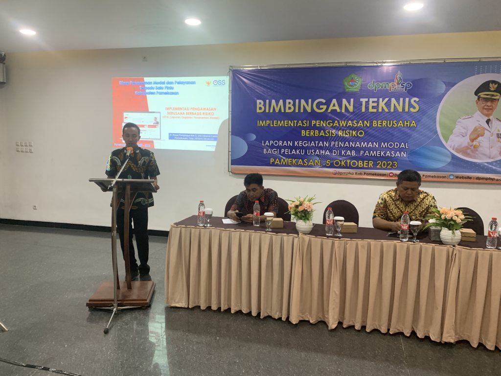 Satuan Tugas Pengawasan dan Pengendalian DPMPTSP Pamekasan melaksanakan Kegiatan Bimbingan Teknis Implementasi Perizinan Berusaha Berbasis Risiko sekaligus Laporan Kegiatan Penanaman Modal Triwulan III Tahun 2023 (Chapter IV) pada hari Kamis, 05 Oktober 2023 yang bertempat di Mini Ballroom Hotel Cahaya Berlian Pamekasan.