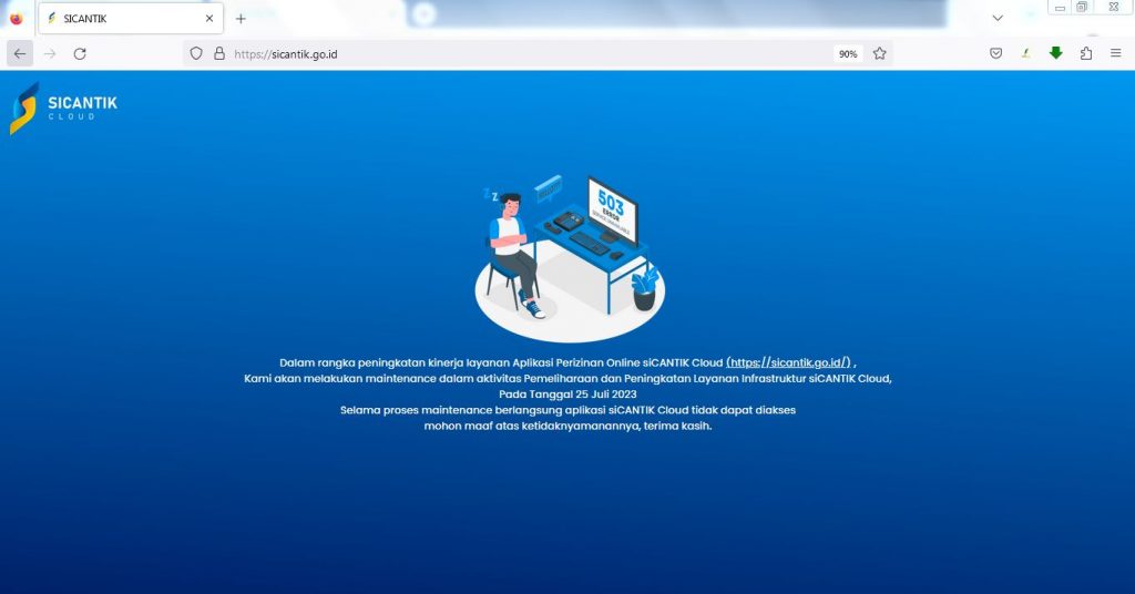 mohon maaf atas ketidak nyamanannya dalam melakukan akses pada aplikasi sicantik, dikarenakan saat ini sedang dalam pengecekkan oleh TIM. mohon berkenan untuk menunggu, akan kami informasikan kembali jika sudah bisa diakses Surat pemberitahuan maintenance Sicantik https://sicantik.go.id/assets/file/B-699%20Surat%20Pemberitahuan%20Maintenance%20siCANTIK%20Cloud.pdf.pdf